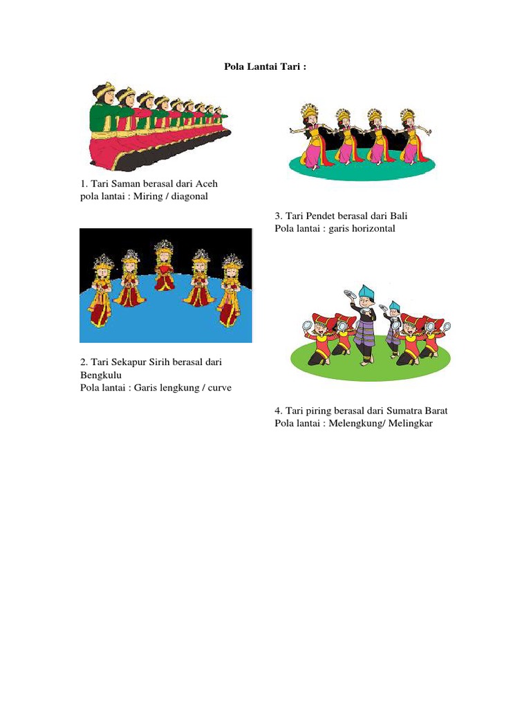 Pola lantai tari beserta gambar dan contohnya. Pola lantai vertikal (lurus) tari klasik banyak menggunakan pola lantai vertikal. Siapa yang tidak kenal dengan tari saman, tarian khas yang berasal dari provinsi aceh yang kepopulerannya sudah mendunia. Pementasan tari saman ini sangatlah sederhana, hanya terdiri dari belasan orang penari utama dan penyanyi lagu. Apa maksud dibuat formasi demikian pada tari saman dan bagaimana para penari bisa disiplin dalam menerapkan pola lantainya.